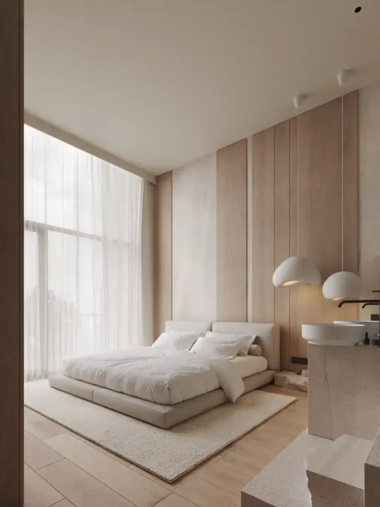 This room embraces serenity with its tall sheer curtains letting sunlight flood the space. The low bed sits on a neutral rug, blending seamlessly with the light wood floors and wall panels. Oversized dome lamps add sculptural detail while keeping the look soft. It’s a perfect example of how natural light enhances a minimalist design.