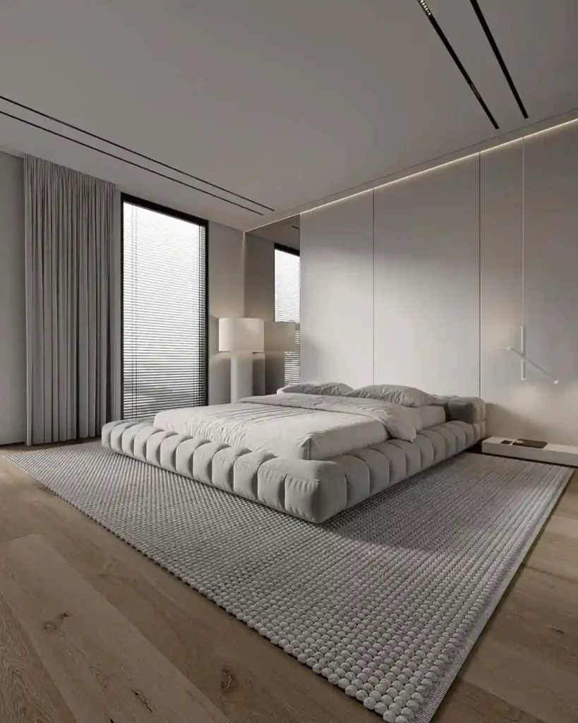 This room embraces a calm gray palette, from the tufted platform bed to the textured rug. Large windows with simple blinds bring in natural light, while modern floor lamps enhance the atmosphere at night. Clean lines, layered bedding, and muted tones make this bedroom both cozy and uncluttered—an ideal minimalist retreat.