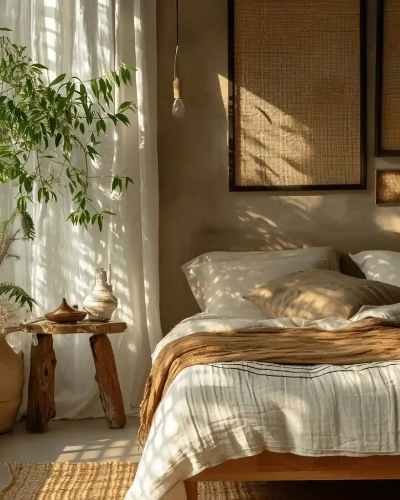 This room glows with natural light streaming through sheer curtains, creating beautiful shadows across the bed. The white bedding with earthy throws feels relaxed yet elegant. A rustic wooden side table with ceramic accents adds texture, while the woven rug grounds the space. It’s a calming blend of minimalism and nature that feels both simple and warm.