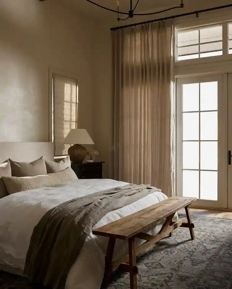 This space combines soft white bedding with earthy brown throws for a cozy effect. A wooden bench at the foot of the bed enhances the rustic vibe. Natural light filters through sheer curtains, creating a gentle mood. The overall design is simple but layered, perfect for anyone who loves minimalist bedrooms with a touch of farmhouse style.