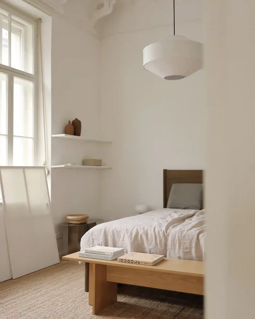 Soft white walls and a light wood bench make this room feel airy and grounded. The bedding stays simple, while the use of natural textures—like the jute rug and wooden accents—brings warmth. Floating shelves hold minimal decor, keeping the room uncluttered. This design proves how a few organic elements can make a minimalist bedroom inviting.