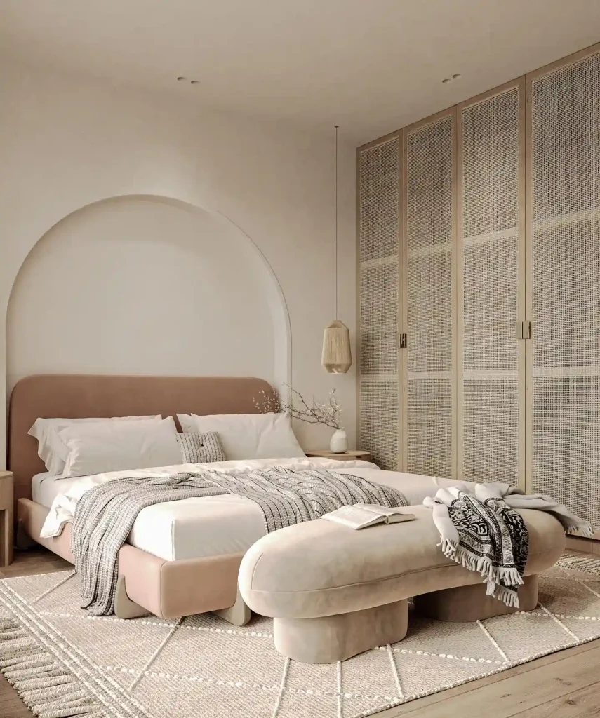Here, the arched wall detail behind the bed creates a gentle focal point. Plush beige bedding and a rounded bench add softness, while the textured wardrobe panels keep the design light. A neutral palette with layered textiles and subtle patterns on the rug make the space feel cozy but uncluttered. Perfect for a minimalist bedroom with character.