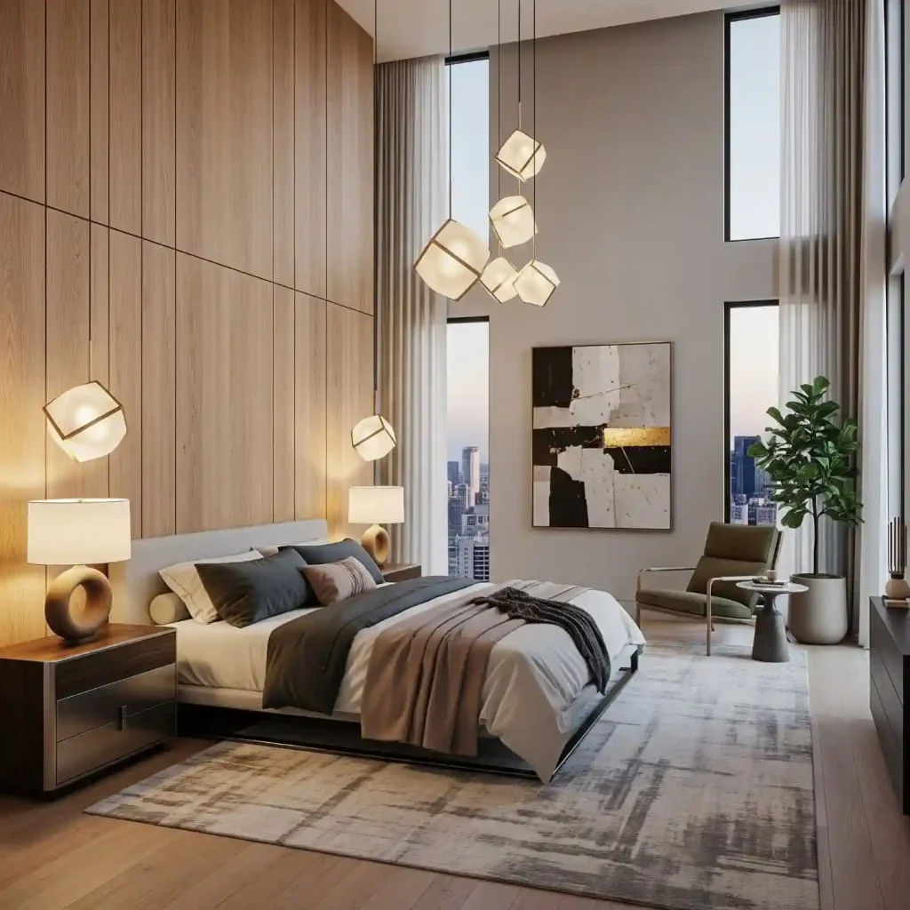 Floor-to-ceiling windows make this room bright and expansive, while wood paneling behind the bed adds warmth. A low bed with gray and white bedding blends effortlessly into the earthy tones. Modern pendant lighting and a large abstract painting give the room a sleek yet artistic feel.