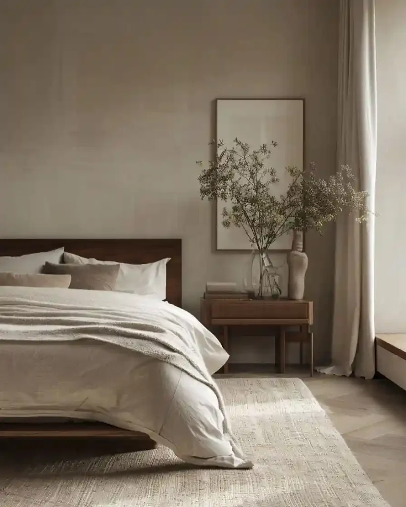 This room combines warm beige walls with rich wood furniture for a timeless style. The neatly layered bedding in soft neutrals keeps the look understated, while a large vase with greenery adds freshness. The framed neutral art above the bed blends into the palette, ensuring nothing distracts from the room’s calm atmosphere.