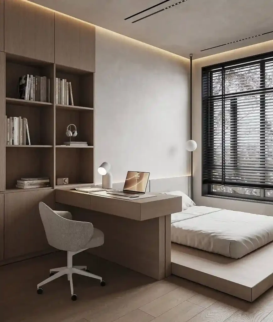 This smart design combines a low bed with a built-in desk, perfect for small spaces. The wall-to-wall shelving keeps books and essentials organized, while warm wood tones balance the room’s clean lines. Blackout blinds provide privacy, while modern pendant lighting keeps the vibe fresh. A practical yet stylish solution for minimalist living.