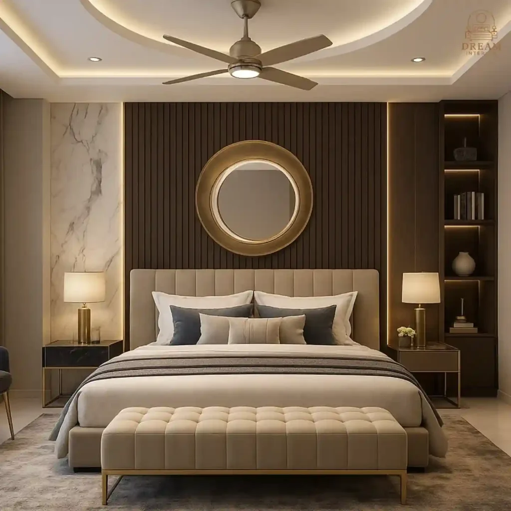 This space shows how minimalism can still feel rich. A paneled wall with marble detail frames the upholstered bed, while a round gold mirror adds a glamorous focal point. Neutral bedding layered with accent pillows feels polished, and the tufted bench completes the high-end minimalist look.