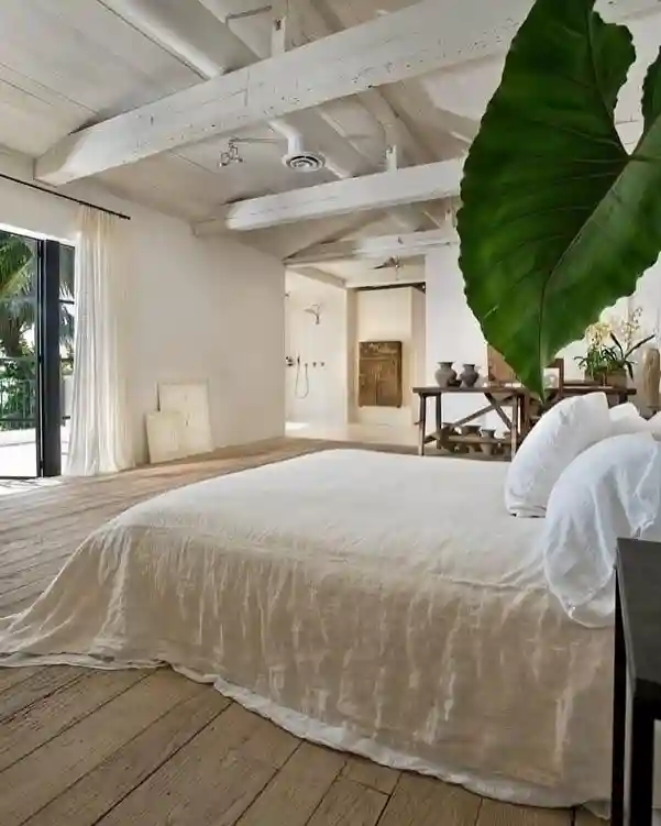Exposed beams and wide plank flooring give this minimalist bedroom a breezy, open feel. The low bed dressed in white linen blends effortlessly with the airy architecture. A large leaf plant adds an organic statement, while the open layout connects the bedroom to the rest of the loft. It’s a great example of how minimalism thrives in bright, open spaces.