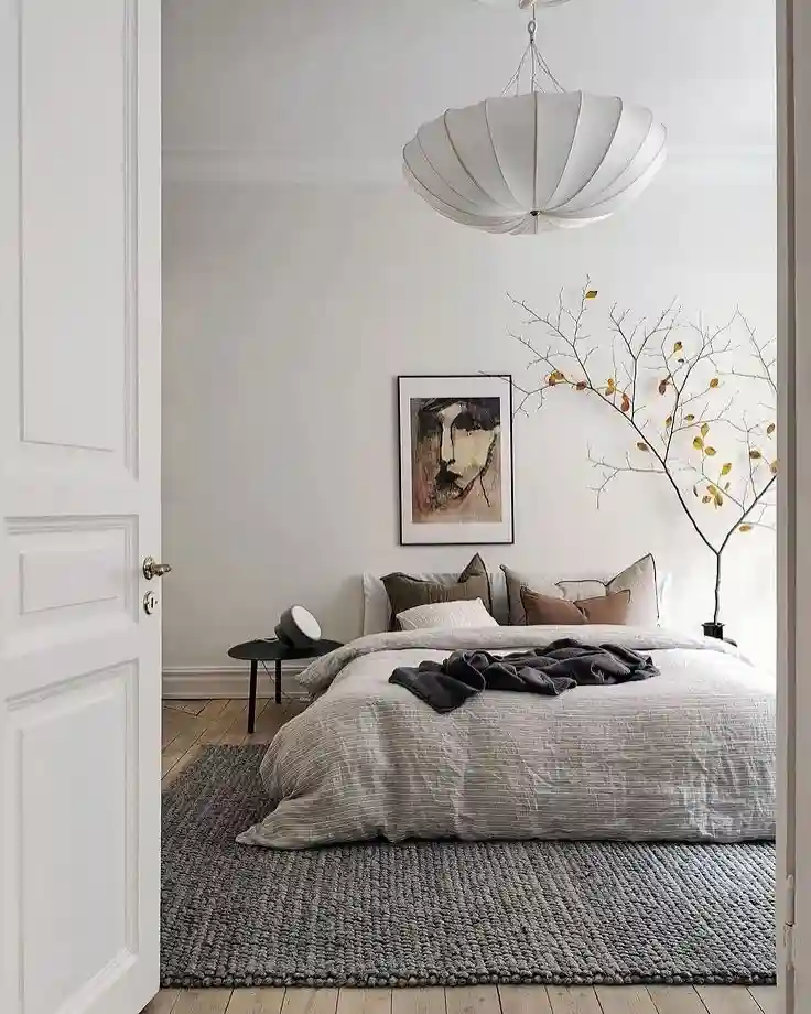 Here, a low bed with textured gray bedding sets the stage for a laid-back vibe. A chunky woven rug and layered pillows bring comfort, while the branch in the corner adds a natural sculptural element. The oversized pendant light feels playful but still keeps with the minimalist theme. Artwork above the bed ties everything together in this simple yet artistic space.