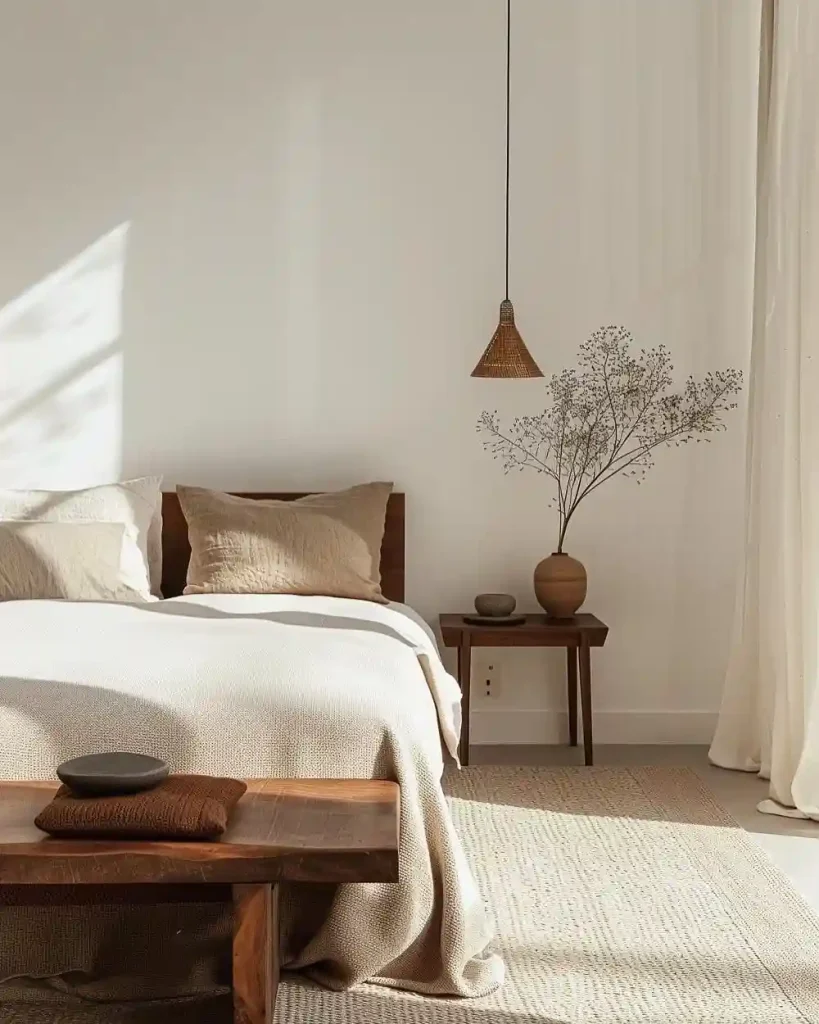 Light streams into this bedroom, highlighting the simple textures of linen bedding and woven decor. A small wooden bench at the foot of the bed adds function and character. The clay vase with delicate stems on the nightstand shows how a single accent can bring warmth to a minimalist room. The design is uncluttered yet full of charm.