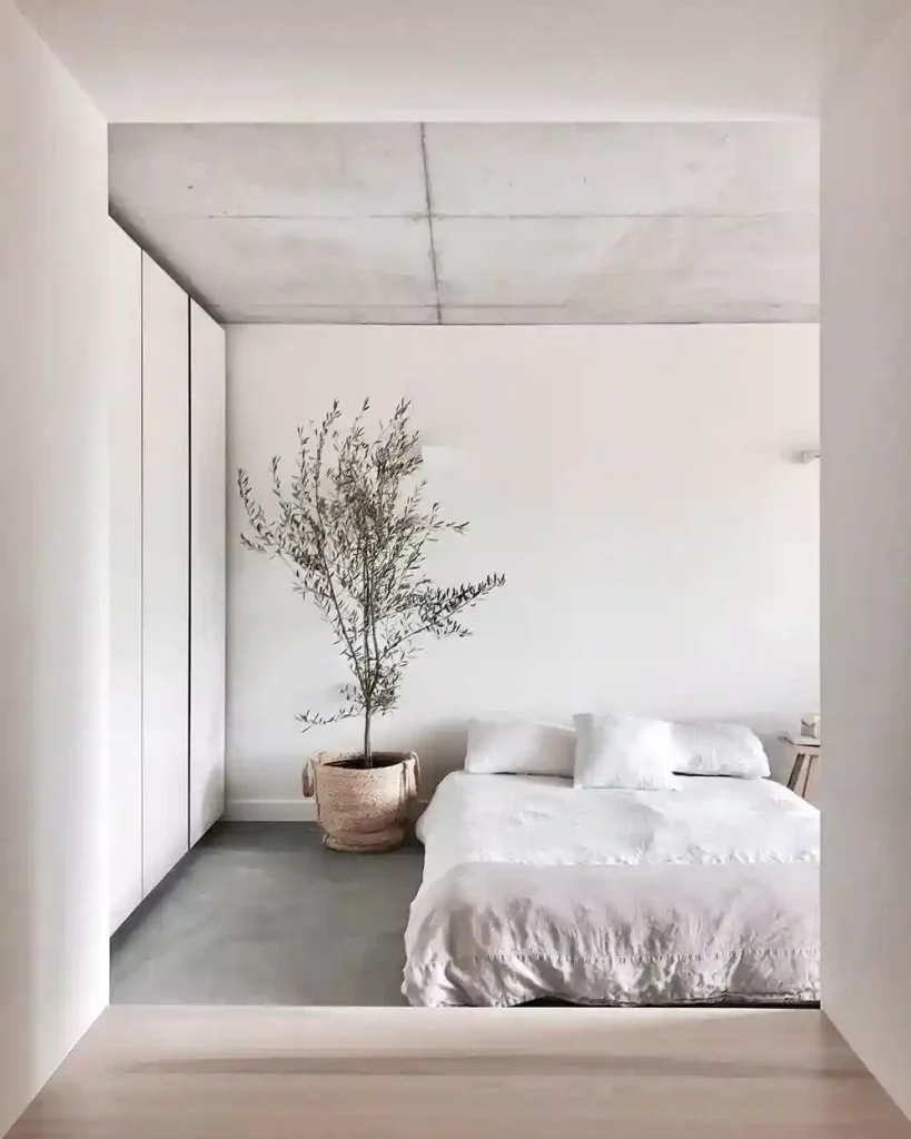 With its white walls, concrete ceiling, and uncluttered layout, this minimalist bedroom is the definition of simplicity. A low bed dressed in crisp white linen keeps the look fresh, while the woven basket planter with a tall olive tree adds softness. Built-in storage along the wall ensures the space stays organized and sleek.
