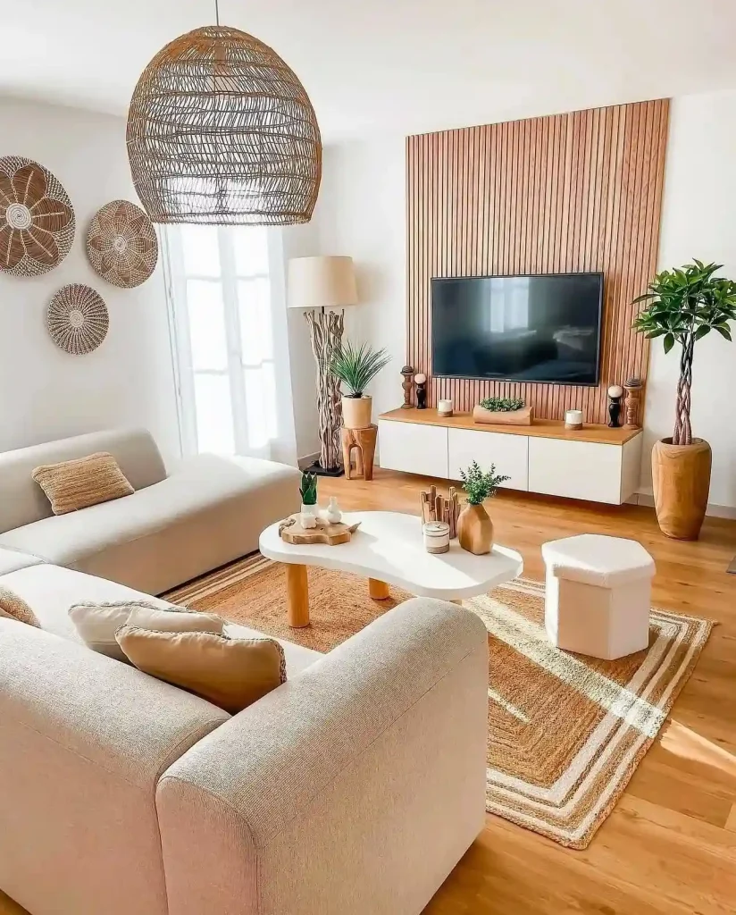 Woven lighting, wood accents, and neutral fabrics give this room an organic feel. The textures add depth while keeping the palette calm and cohesive. Best for relaxed homes that use natural materials to create warmth.