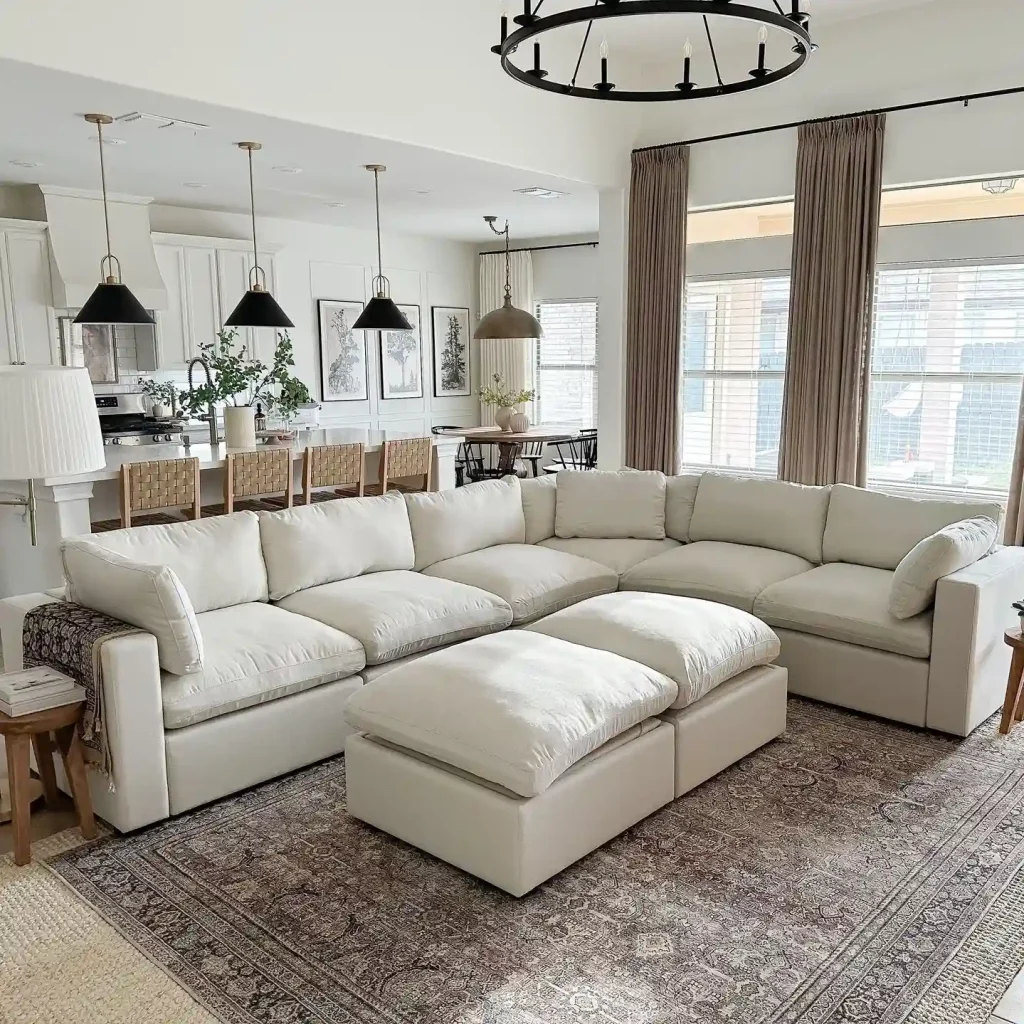 This living room uses soft neutral tones to create a bright yet comfortable atmosphere. An oversized sectional provides generous seating, while layered textiles keep the space from feeling stark.