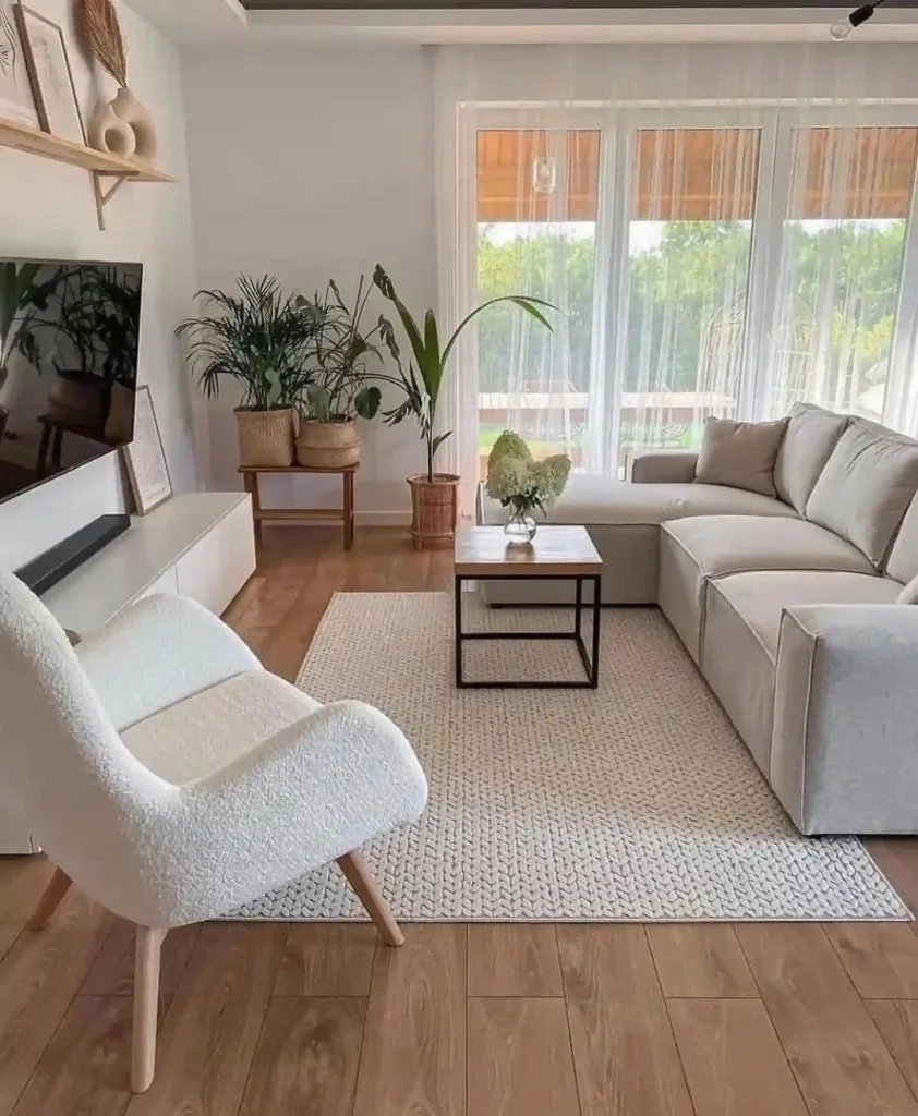Clean lines, light wood flooring, and a neutral color palette give this living room a calm base. Cozy elements like a textured rug, boucle accent chair, and indoor plants add warmth without visual clutter. Great for anyone who loves minimal design but wants a cozy atmosphere.