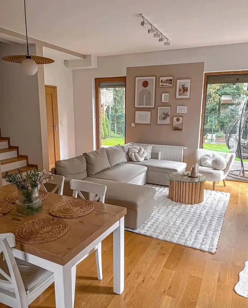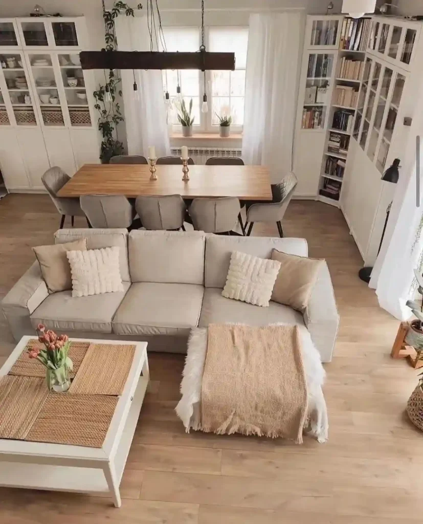 Soft fabrics and warm wood tones bring a gentle rustic touch to this modern layout. A neutral sofa paired with textured pillows keeps the space relaxed, while natural light enhances the open feel. Works well in family homes that mix modern furniture with warmth.