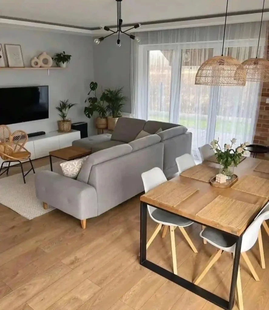 This open-concept layout balances comfort and flow. A gray sectional anchors the space, while rattan chairs and woven lighting soften the modern structure. Sheer curtains allow natural light to fill the room without feeling harsh. Ideal for open-plan homes where living and dining areas connect.
