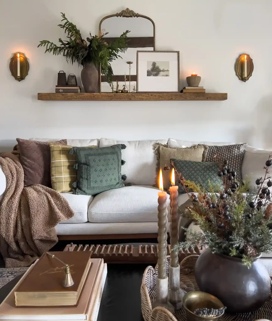 Deeper neutral tones, wood furniture, and soft lighting create an intimate atmosphere. Candles and layered accessories add to the cozy feel without overwhelming the space. Perfect for creating a cozy evening retreat in modern homes.