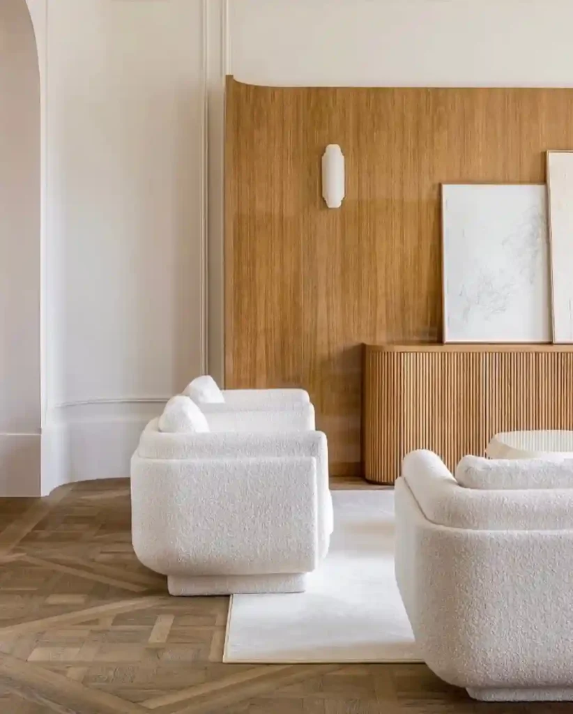 12.Boucle Armchairs and Light Wood Wall Paneling
