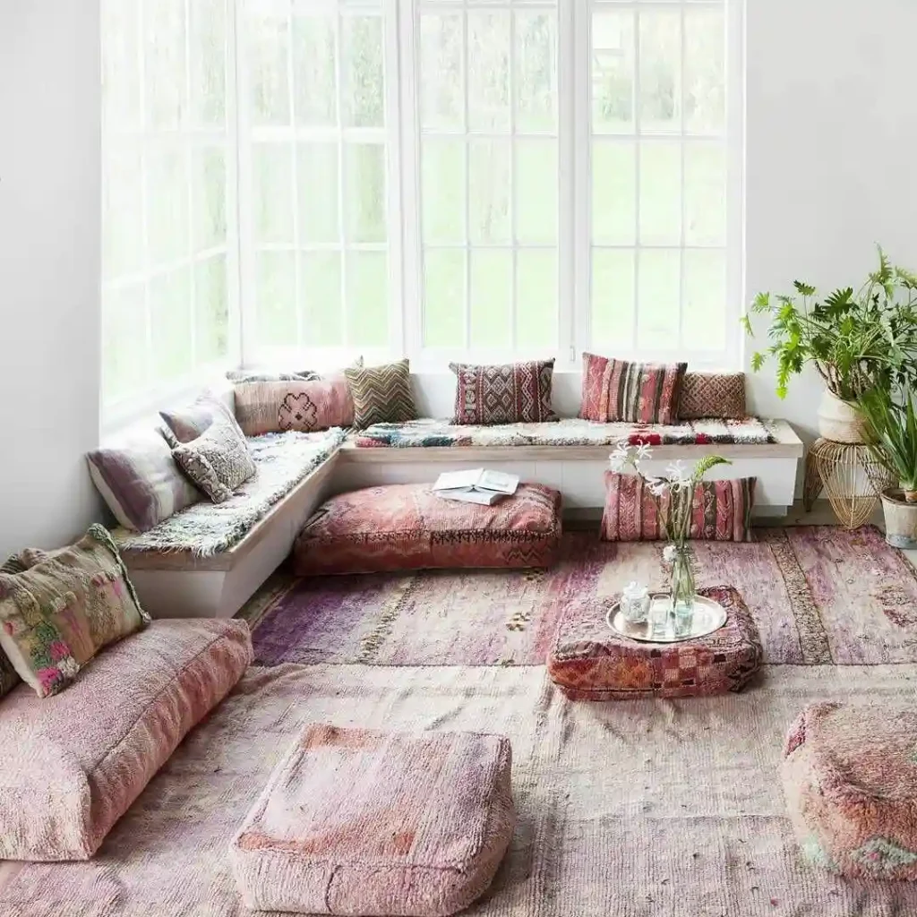 - Start with oversized floor cushions in warm pinks, purples, and oranges