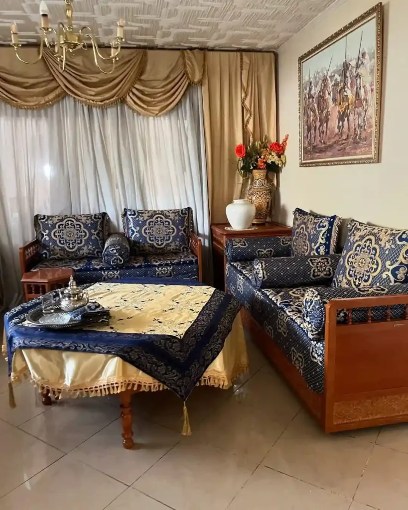 12. Classic Moroccan Salon with Blue and Gold Accents