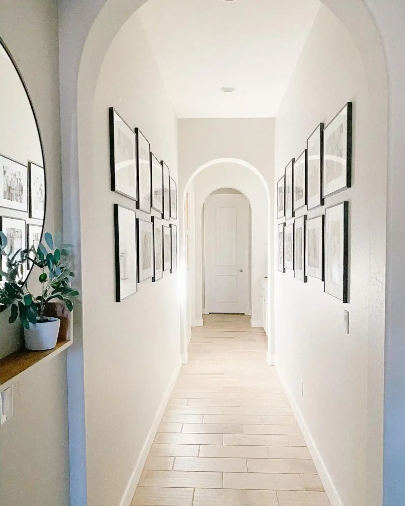 Architectural arches instantly elevate this hallway, while a slim floating shelf provides a practical spot for keys and mail. Symmetrical artwork draws the eye upward, making the hallway feel taller and more balanced.