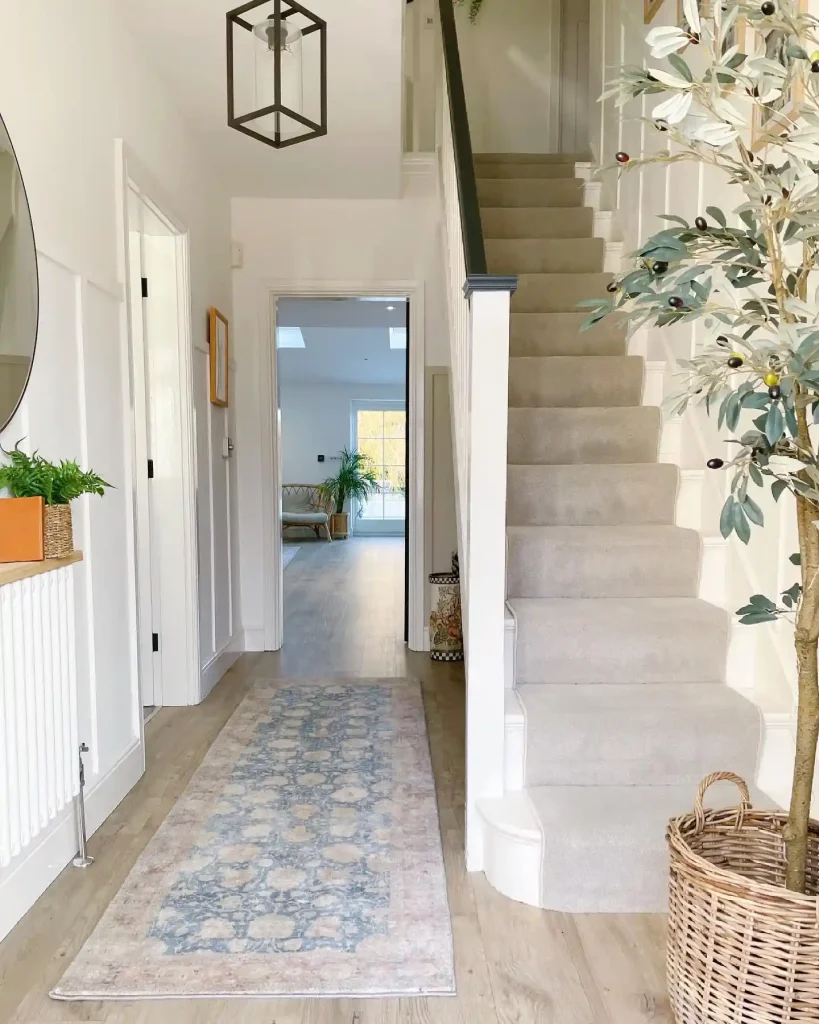 Neutral colors and soft textures keep this hallway light and calm. A woven basket near the stairs stores shoes or throws while doubling as decor.