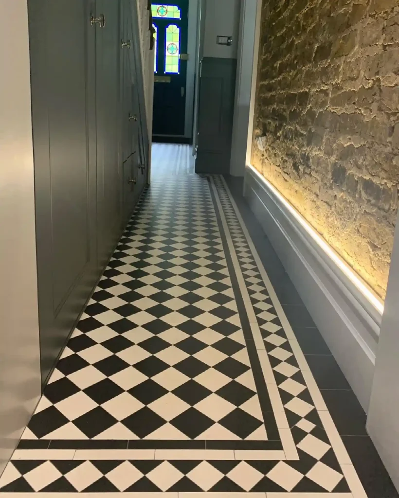 This narrow hallway uses a bold black-and-white patterned floor to add character without overwhelming the space. Neutral walls help keep the area open, while a slim storage bench offers hidden space for shoes and daily essentials. A radiator cover doubles as a shelf for decor, and wall hooks reduce floor clutter. This setup works well for homes that need storage without sacrificing style.