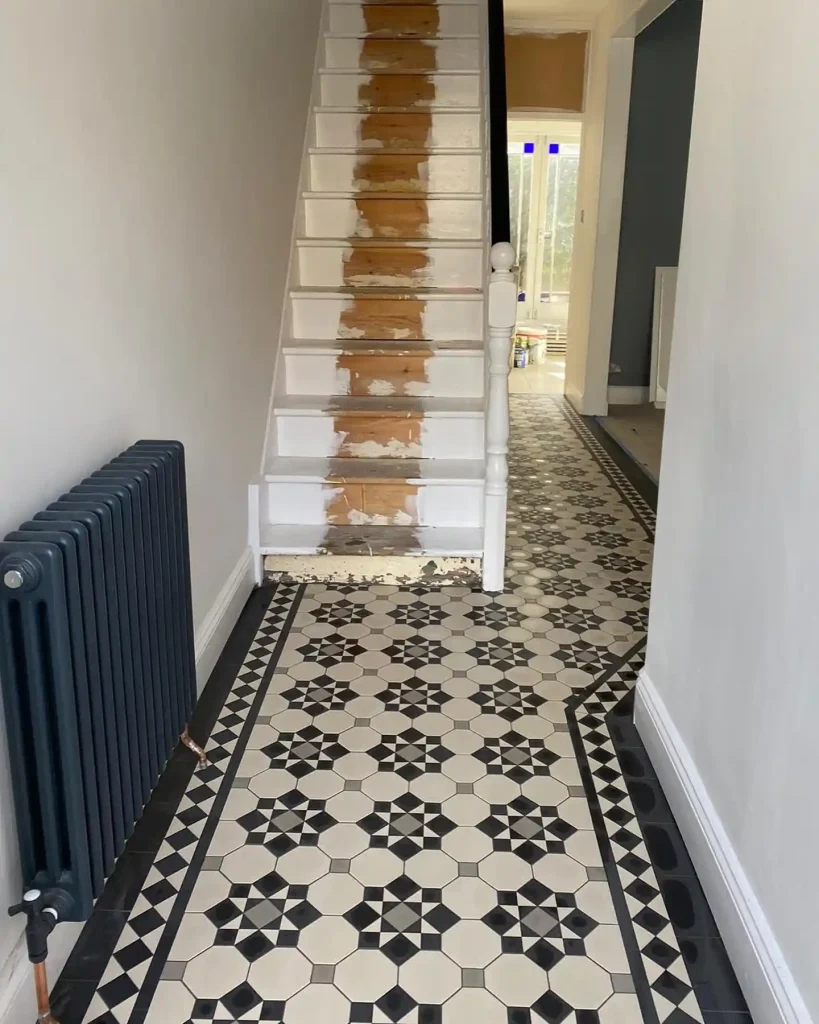 Geometric floor tiles add interest while under-stair drawers provide smart hidden storage. This setup makes use of space that’s often ignored in narrow hallways.