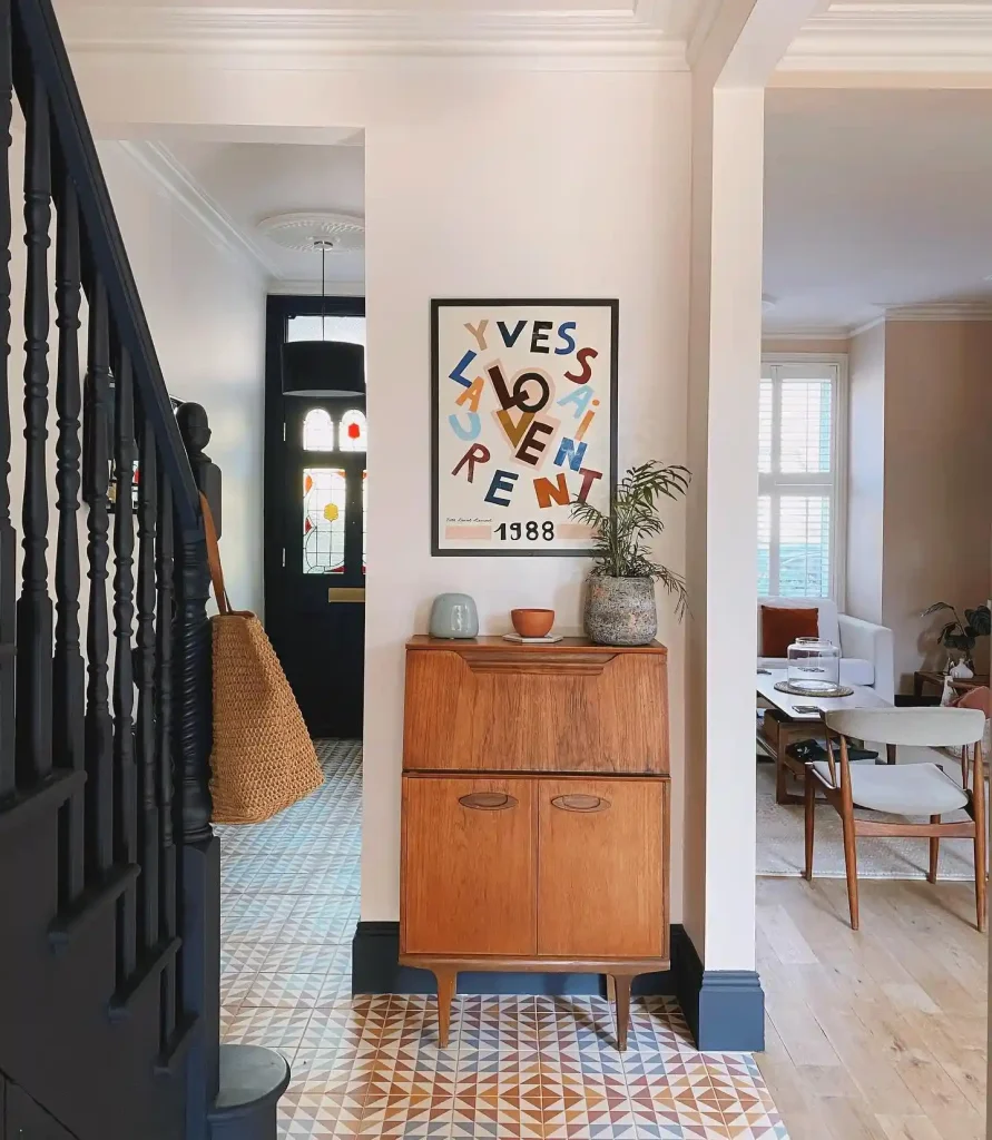 A narrow retro cabinet provides hidden storage while adding character. Patterned tiles and modern artwork keep the space balanced and stylish.