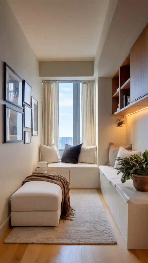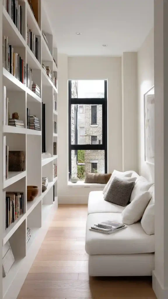 Storage can easily take over a narrow room if you’re not careful. That’s why using one full wall for vertical storage works so well it keeps the floor clear and the layout clean. Built-ins also make the space feel custom instead of crowded.