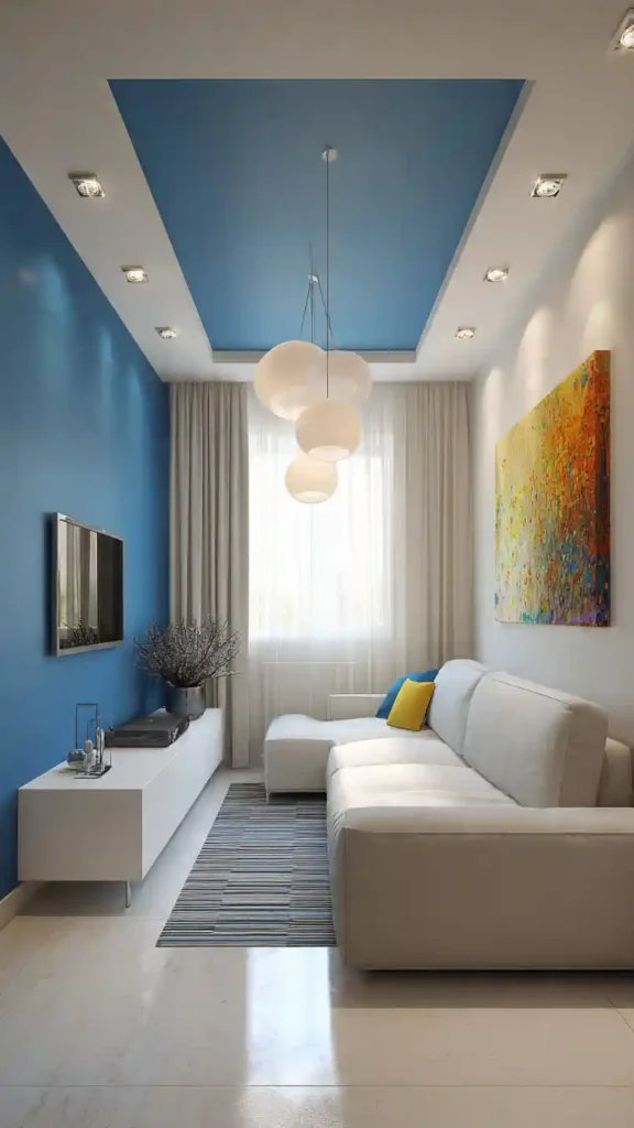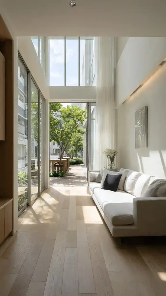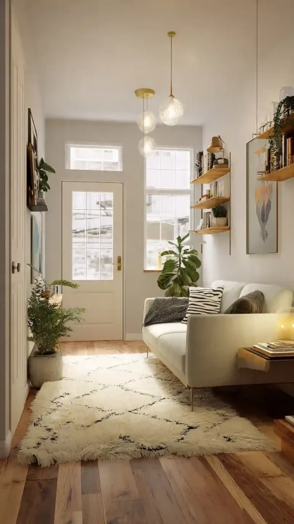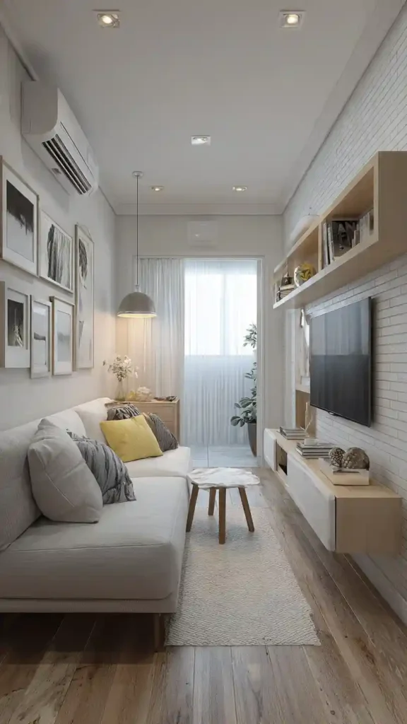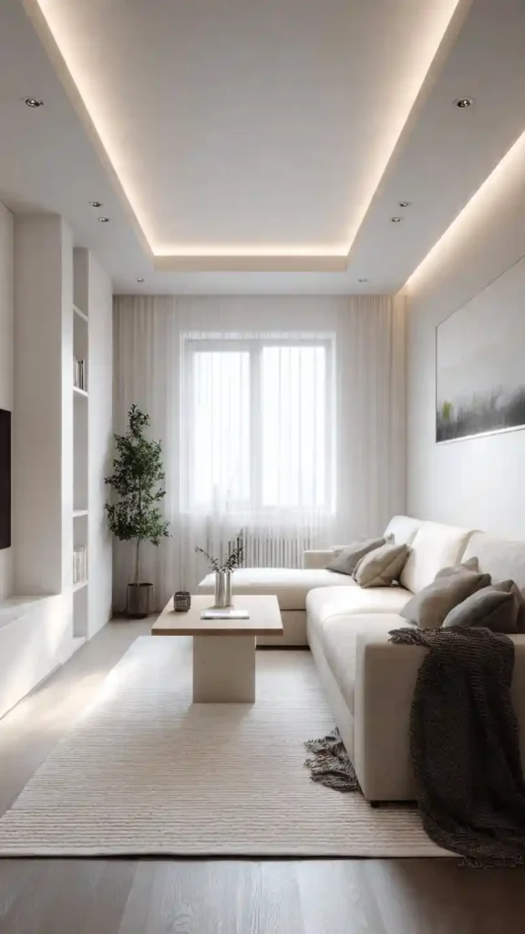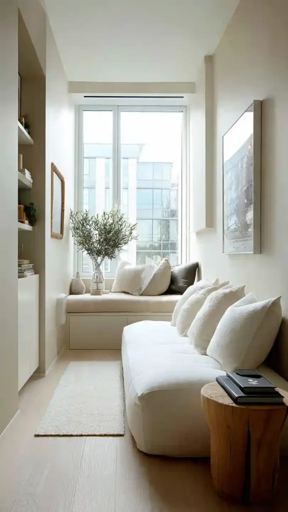 Color plays a bigger role than layout in narrow spaces. Using light tones like white, beige, and soft greys reflects light and visually stretches the room. It doesn’t just look bigger it feels calmer and less crowded.