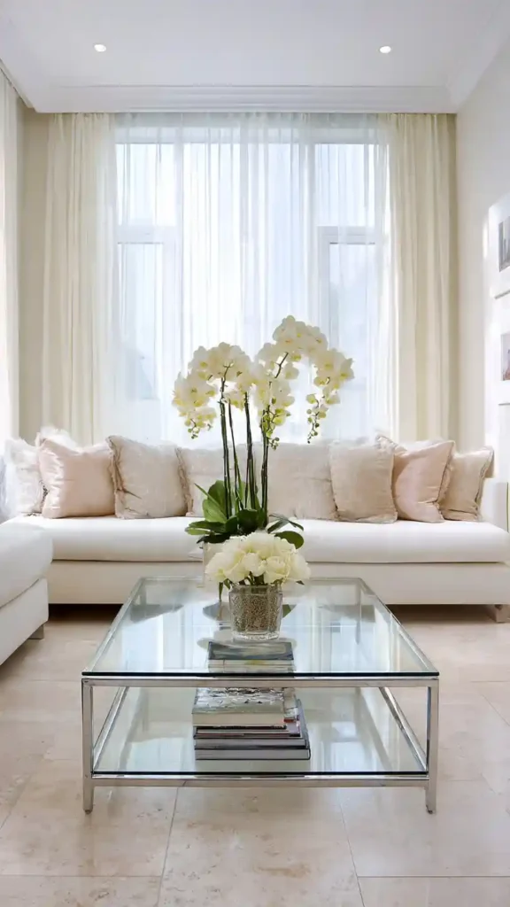 Heavy furniture visually weighs down a narrow room, even if there’s space around it. A glass or acrylic coffee table keeps things feeling open because your eyes can pass through it. It’s a small change, but it makes a big difference.