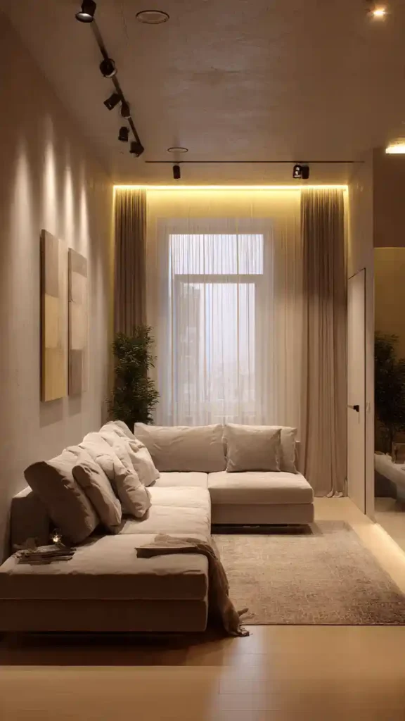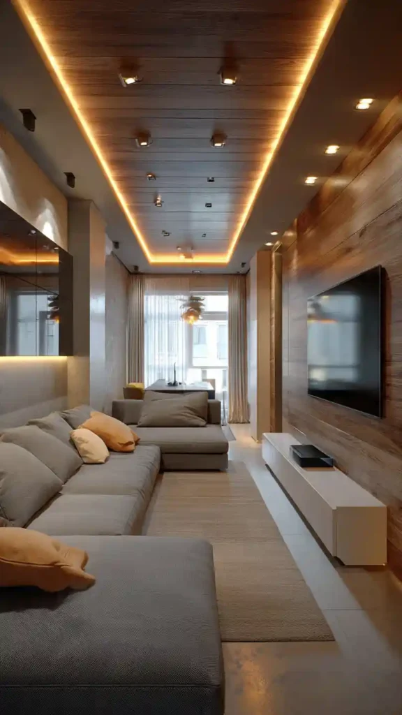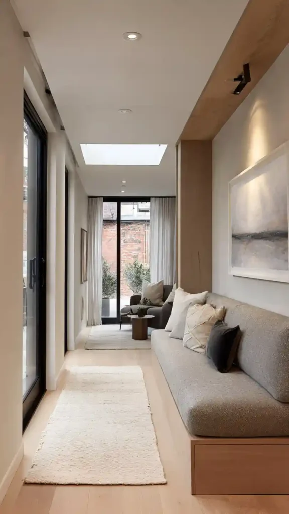 Lighting can quietly shape how a room feels. In a narrow space, using lights that follow the length of the room helps stretch it visually. It guides the eye from one end to the other, making the layout feel more balanced.