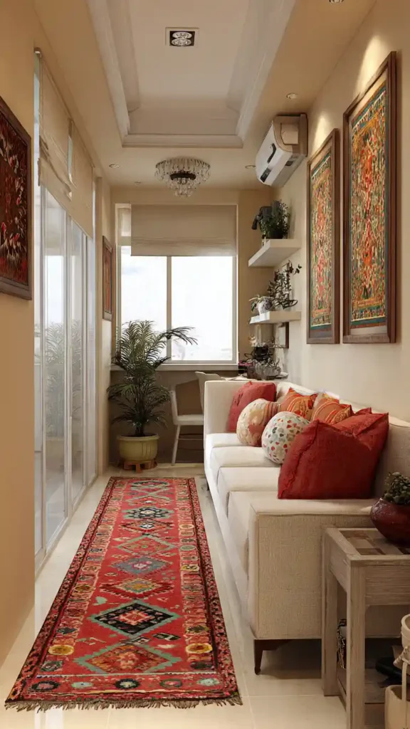 A runner rug is a small detail, but it quietly guides how your eyes move through the room. In a narrow layout, placing a long rug helps stretch the space visually and makes everything feel more intentional instead of scattered.