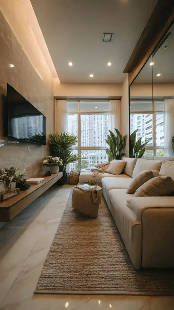 A large mirror can completely change how a narrow living room feels. It reflects both light and space, so the room instantly looks wider without moving a single piece of furniture. Placing it across from a window works best because it doubles the natural light.