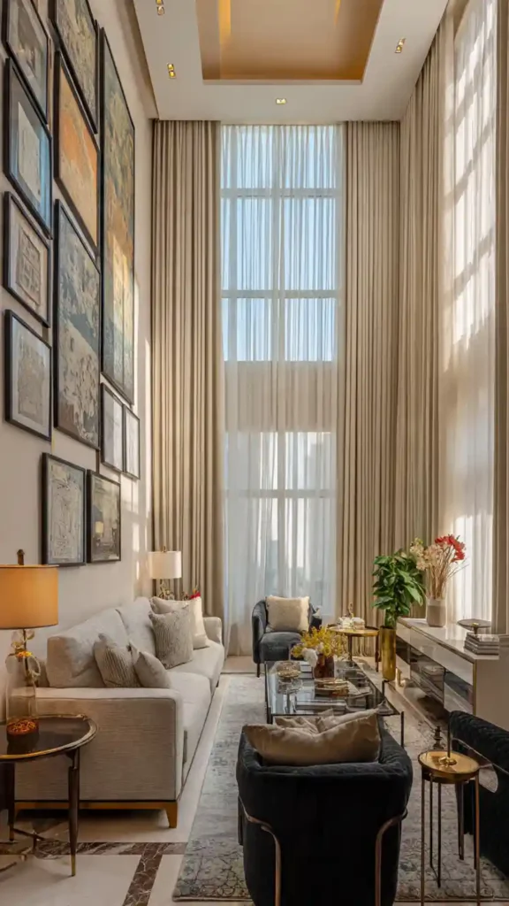 When floor space is limited, your best move is to draw attention upward. Tall curtains, vertical wall art, or even a floor lamp can make the room feel taller and less compressed. It changes how the space feels without adding clutter.