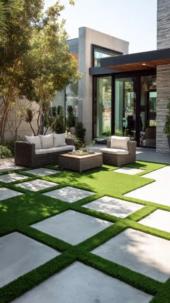 Instead of covering the entire yard, using artificial turf in sections creates contrast and keeps things more interesting. It gives you that green look without the maintenance, but in a smarter and more controlled way. This works especially well in modern layouts where geometry plays a big role.