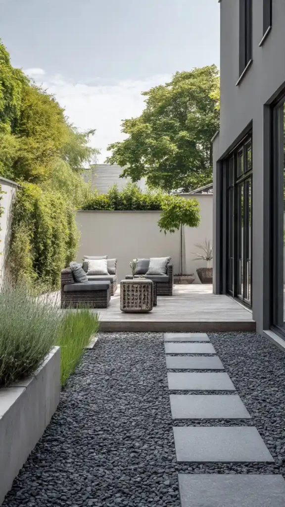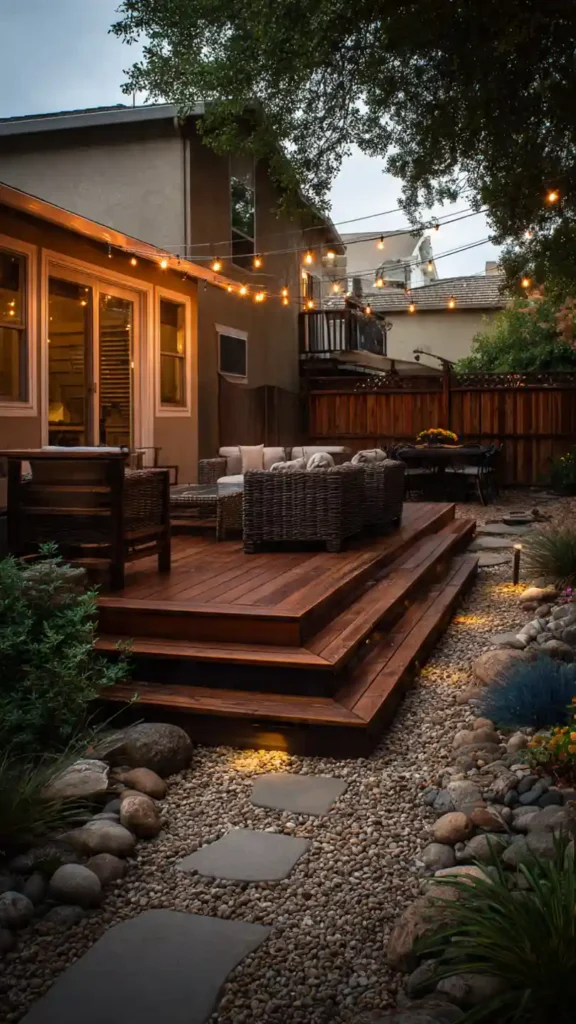Combining a wooden deck with gravel gives you the best of both worlds warmth and structure. The deck creates a defined seating area, while gravel fills the rest without needing constant maintenance.