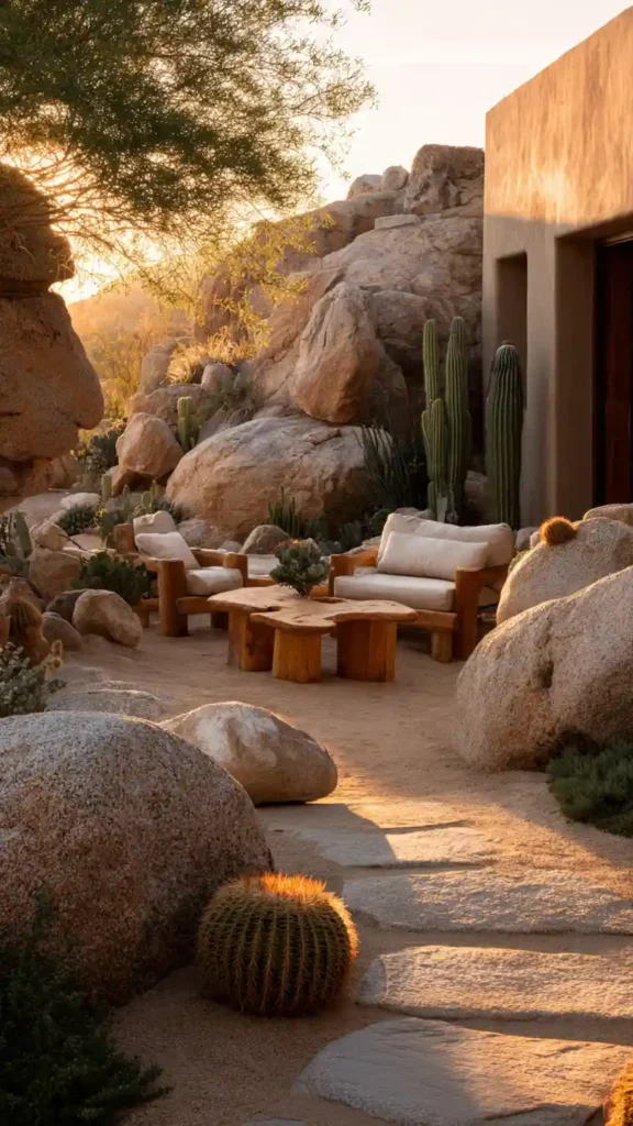 A desert-style backyard is one of the lowest maintenance options you can go for. Instead of fighting to grow grass, you work with natural elements like sand, gravel, and drought-friendly plants. The result feels relaxed and intentional, especially in hot climates where lawns struggle.