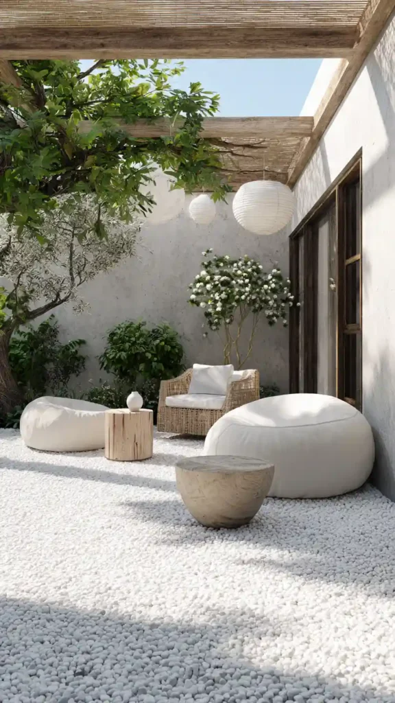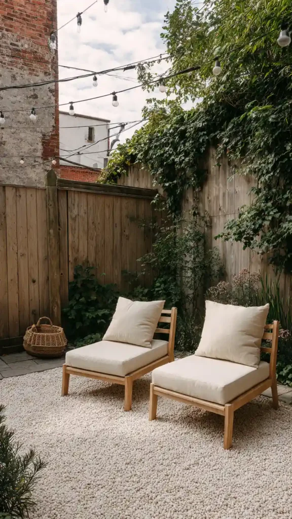 A gravel relaxation yard is one of the easiest ways to replace grass without losing that open, airy feel. The texture of gravel instantly makes the space feel intentional instead of empty. When paired with simple lounge chairs and soft lighting, it turns into a quiet spot you’ll actually want to use every day.