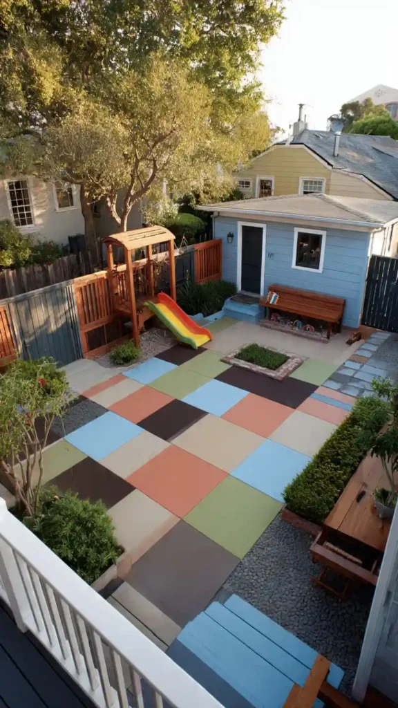 A kid-friendly backyard without grass can actually be more practical. Surfaces like rubber tiles or soft artificial turf reduce mess and are easier to maintain. It also gives you more control over safety compared to uneven or muddy lawns.