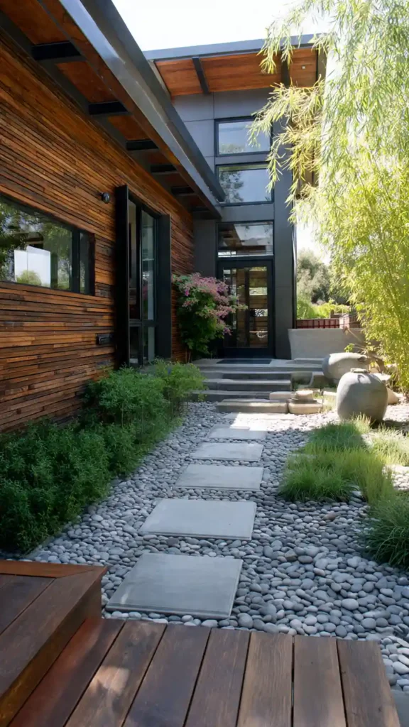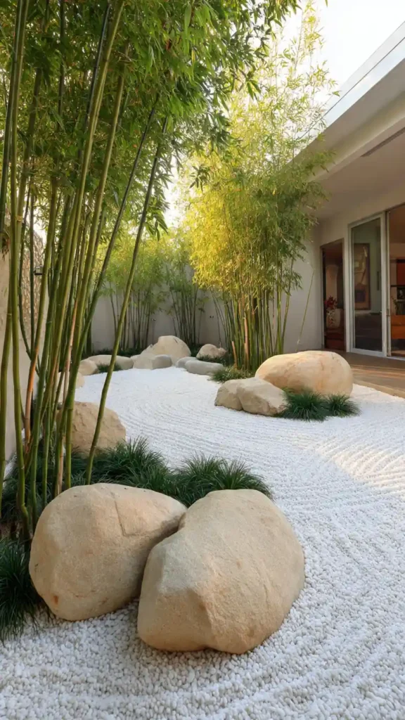A Zen garden backyard is all about calm and simplicity. Instead of filling the space, you let a few elements gravel, stones, and plants do the work. The clean layout makes even a small backyard feel more open and peaceful.