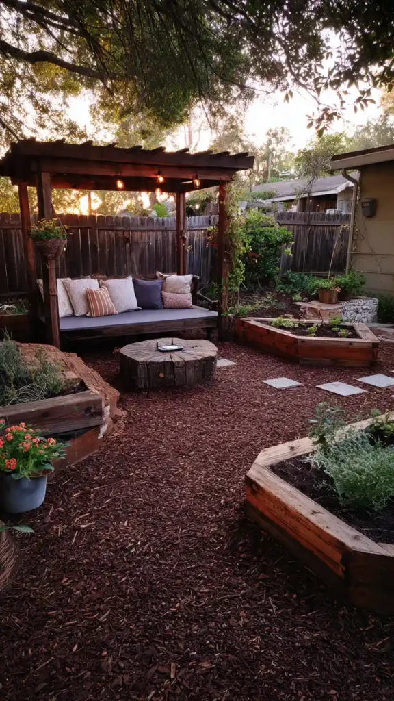 A mulch backyard feels warm and natural without needing grass at all. It’s especially useful if you want a garden-focused space rather than a seating-heavy layout. The texture of mulch softens the yard and works well with plants, making everything feel more connected.