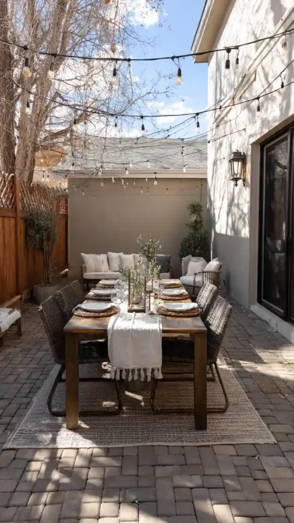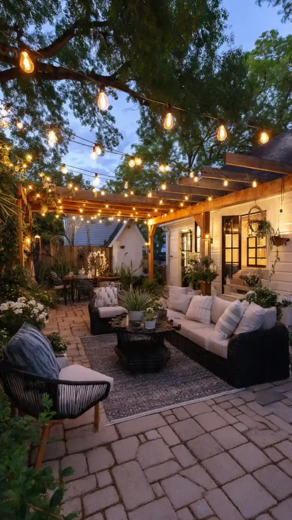 Sometimes the simplest setup works best. A basic patio paired with string lights can completely change how your backyard feels, especially in the evening. It turns a plain area into something warm and usable without needing complex design.