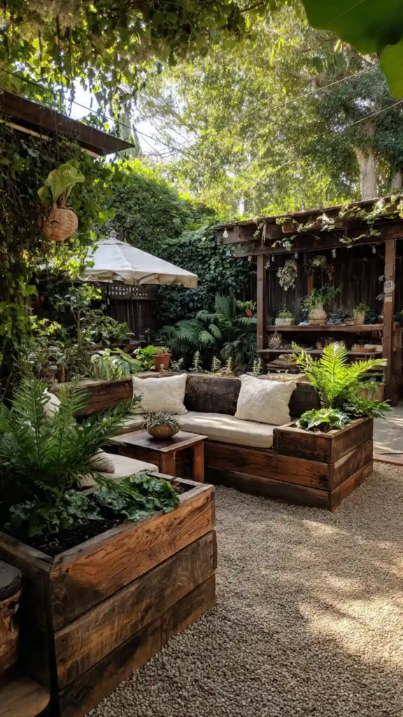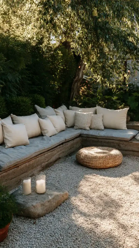 An outdoor lounge corner turns even a small backyard into a place you’ll actually use. Instead of trying to fill the entire space, you focus on one comfortable area with seating, cushions, and a soft setup. It feels more personal and inviting than a wide, empty yard.