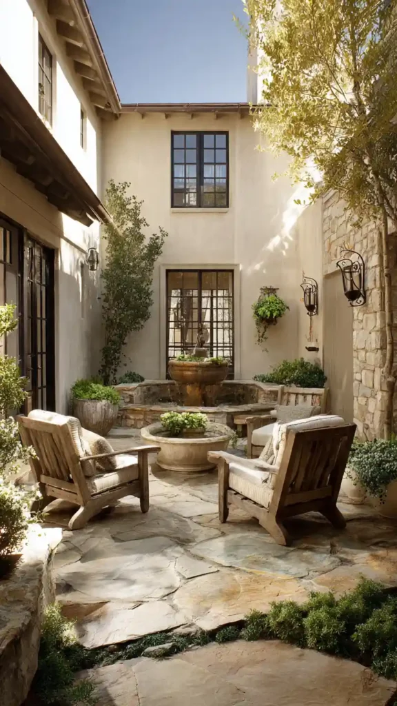 A stone courtyard instantly gives your backyard a timeless and grounded feel. Unlike grass, it doesn’t change with seasons, so the space always looks put together. The natural variation in stone adds texture without needing extra decoration, which keeps things simple but still visually rich.