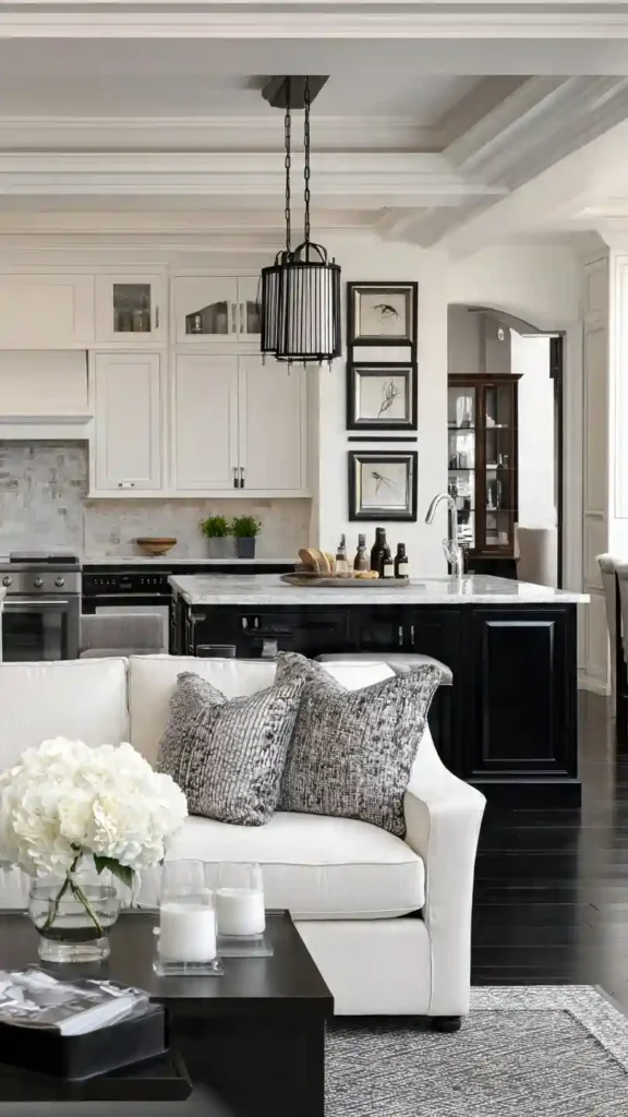 Create contrast by installing a black island against white cabinetry. Place a light-colored sofa nearby to balance the darker elements. Repeat black accents in frames, lighting, or a coffee table to tie the design together. Keep decor minimal to maintain a sharp look. This open kitchen and living room feels bold because you use strong contrast intentionally rather than randomly.
