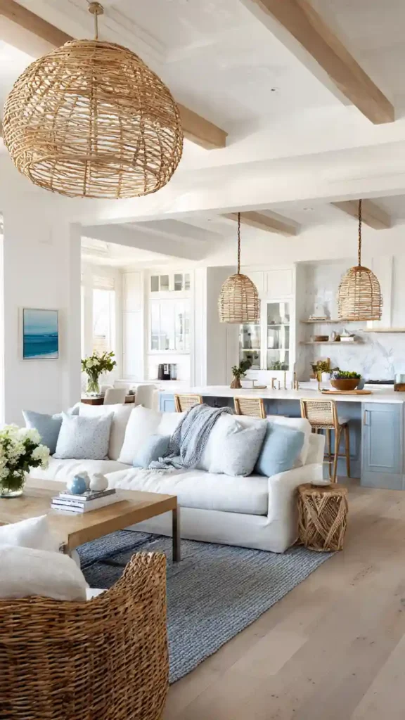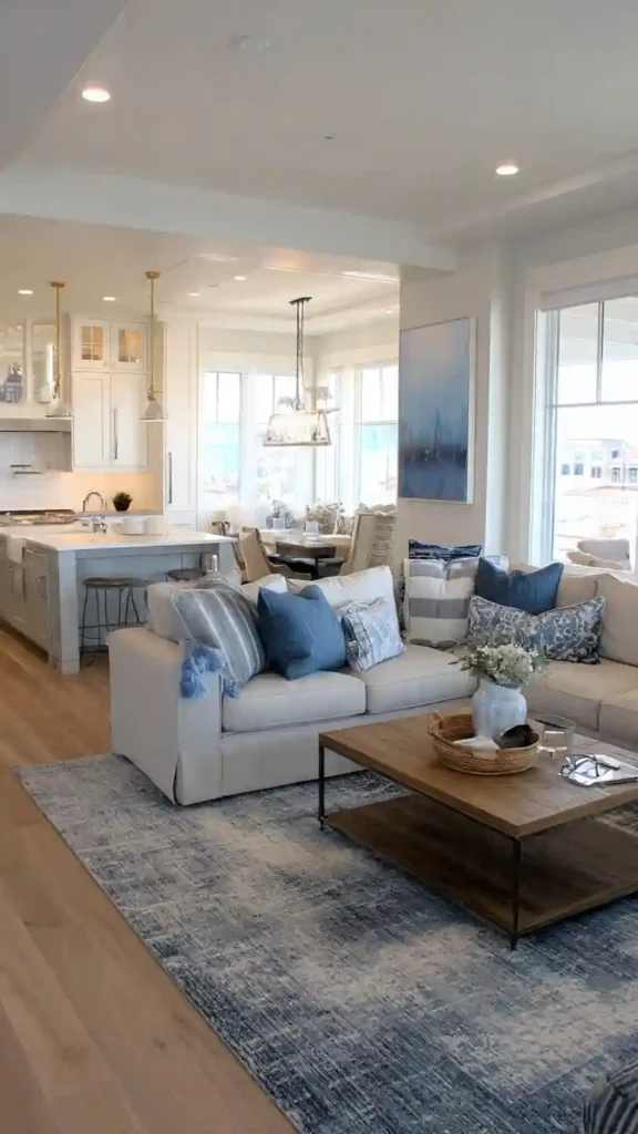 Create a breezy atmosphere by using soft blue accents and crisp white cabinetry. Choose light wood floors to keep the space bright. Add linen sofas and woven pendant lights to introduce texture. Position seating to face both the kitchen and windows for an open feel. This open kitchen and living room feels fresh because you keep colors light and let natural materials lead the design.
