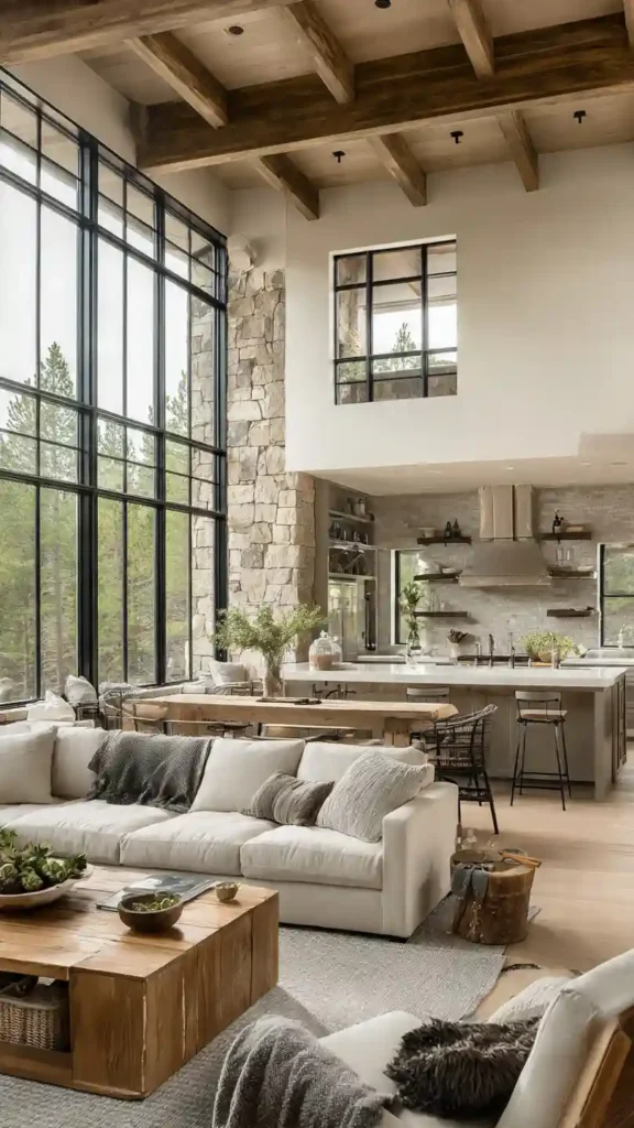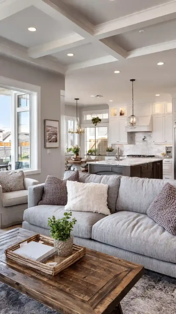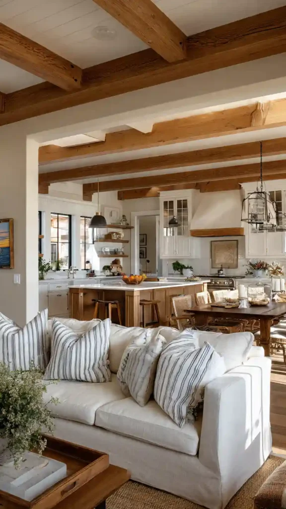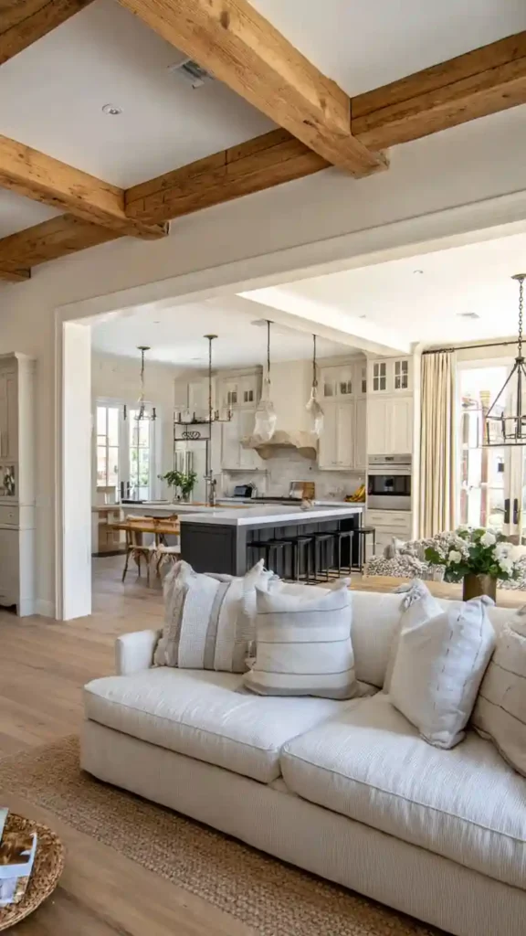 Create warmth by adding wood ceiling beams and shaker-style cabinets in soft white. Position a farmhouse dining table between the kitchen and living space to gently divide the areas. Layer linen sofas, textured throws, and woven baskets to keep everything relaxed. Use warm lighting instead of harsh white bulbs. This open kitchen and living room feels inviting because every material adds comfort and softness.