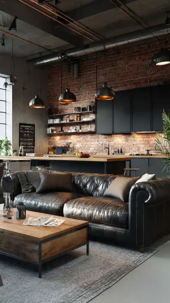 Highlight character by exposing a brick wall as the focal point. Install matte black cabinets and metal pendant lights to strengthen the industrial feel. Balance hard textures with a warm leather sofa and a textured area rug. Keep shelving open to maintain an airy layout. This open kitchen and living room works because you intentionally mix raw finishes with soft seating to create comfort without losing edge.