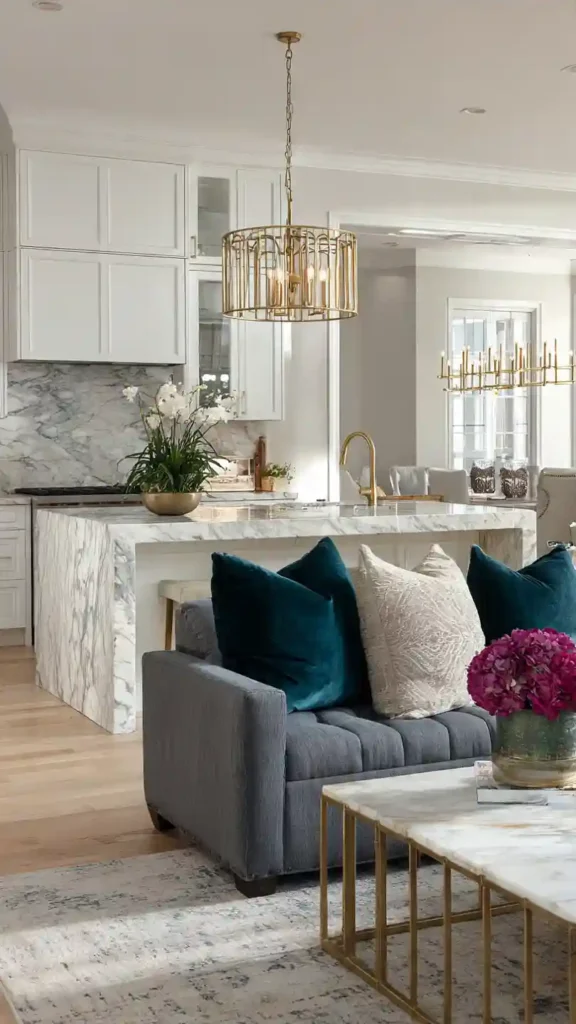 Make the marble island the statement feature. Extend its surface slightly to create seating. Add velvet cushions and metallic accents to elevate the look. Hang a bold chandelier above the living area to balance the island visually. Repeat marble in smaller decor pieces to unify the design. This open kitchen and living room feels refined because you intentionally layer texture and contrast.